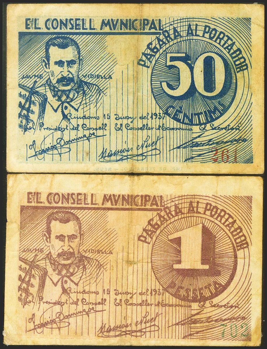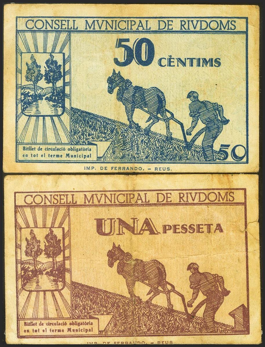 RIUDOMS (TARRAGONA). 50 Céntimos y 1 Peseta. 15 de Junio de 1937. (González: 9696/97). Rara serie completa. MBC+.