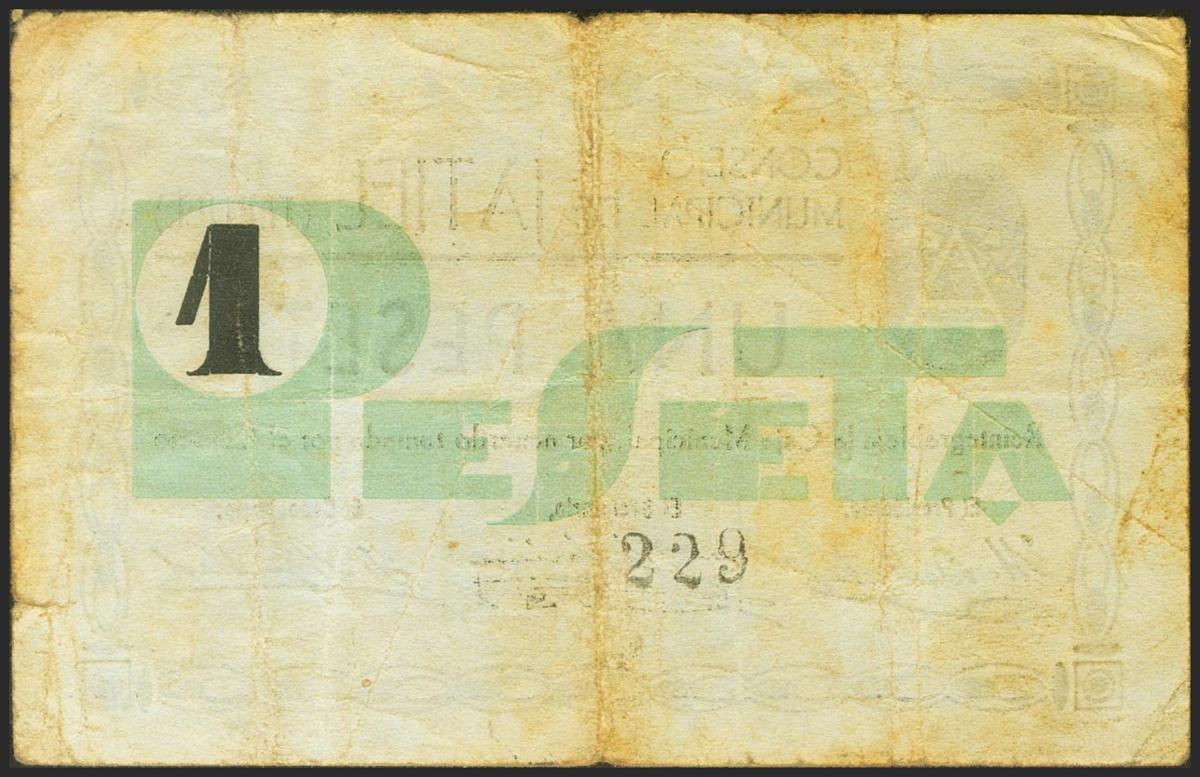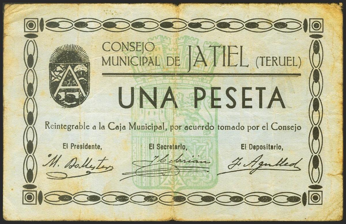JATIEL (TERUEL). 1 Peseta. (1936ca). (González: 3022). Muy raro. BC.