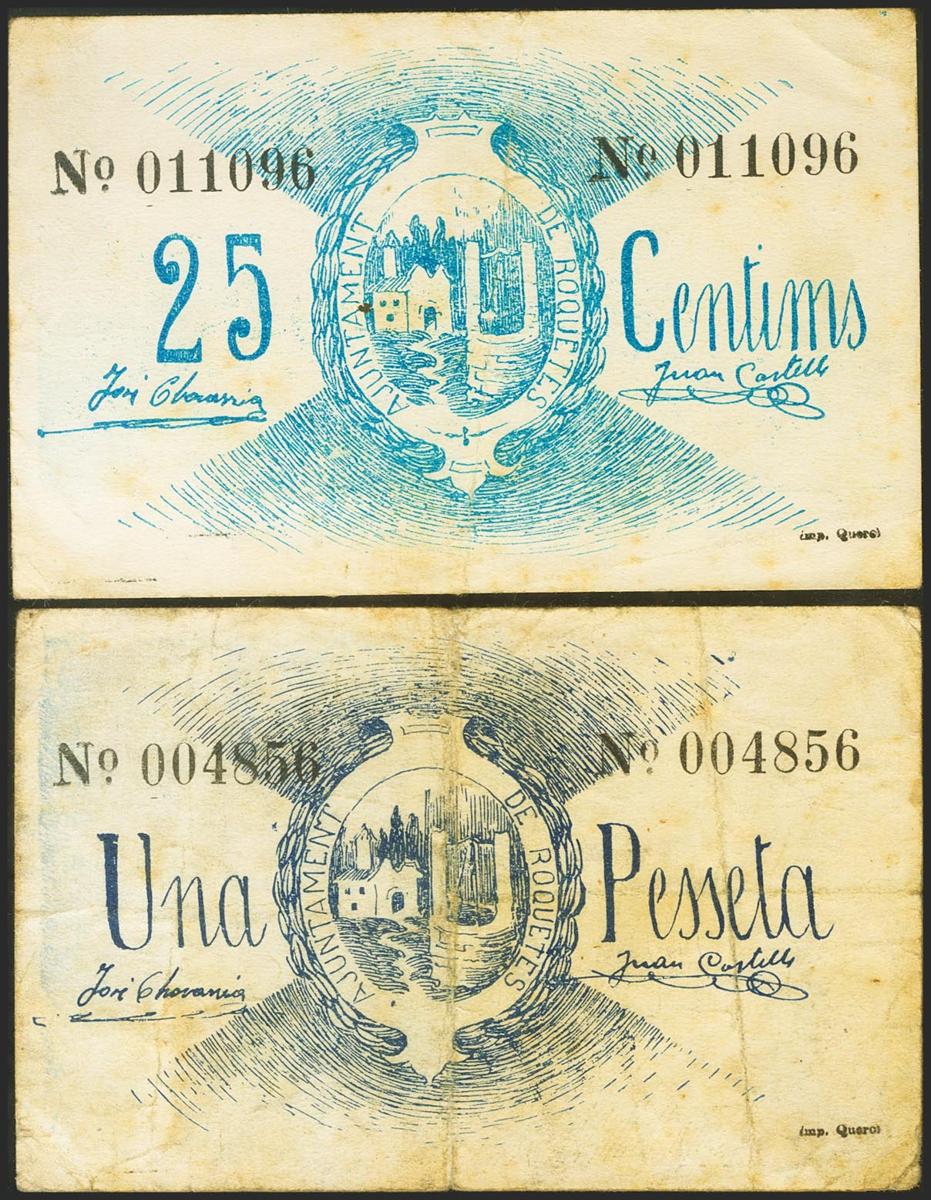 ROQUETAS (TARRAGONA). 25 Céntimos y 1 Peseta. (1936ca). (González: 9735, 9737). Raros. MBC.