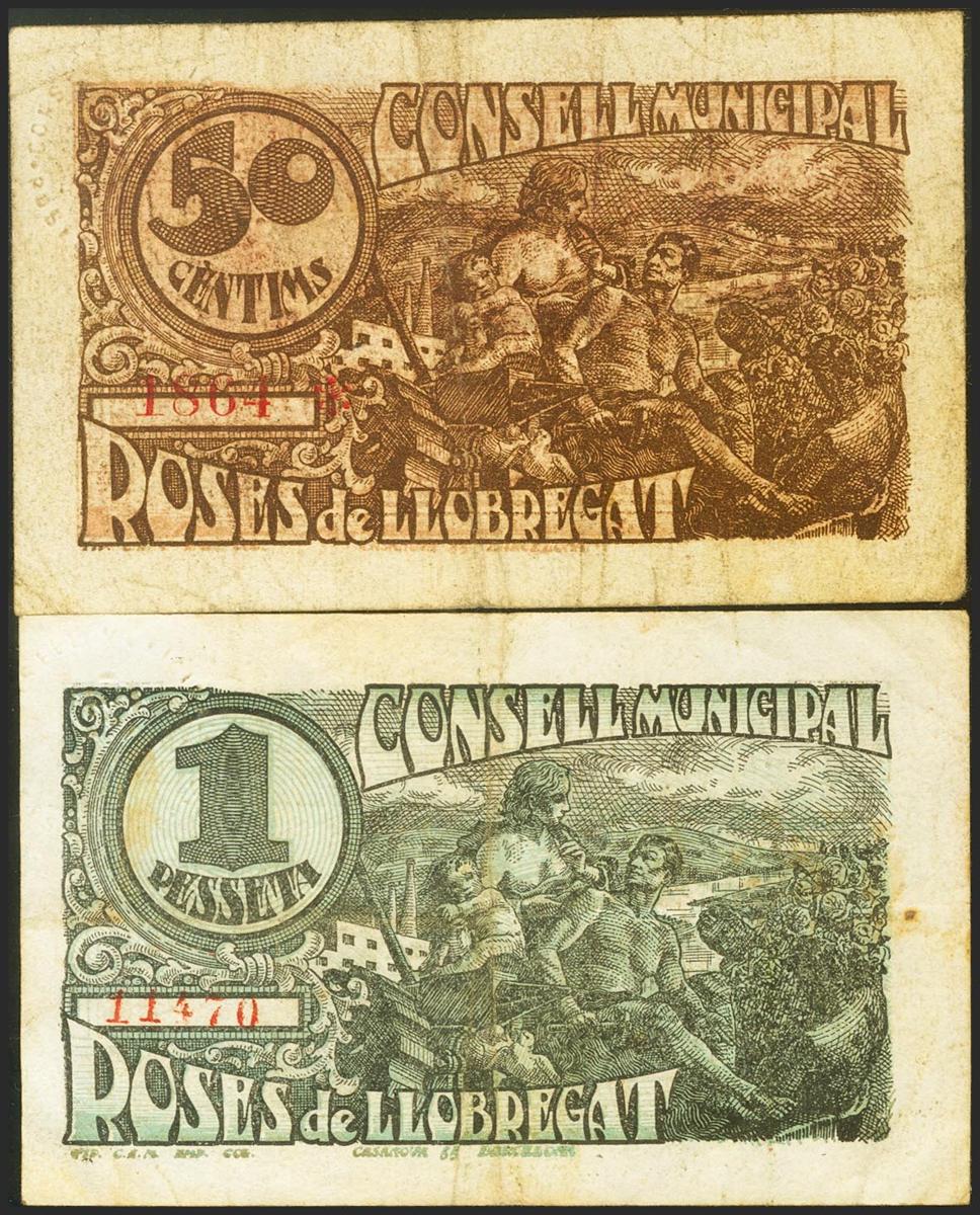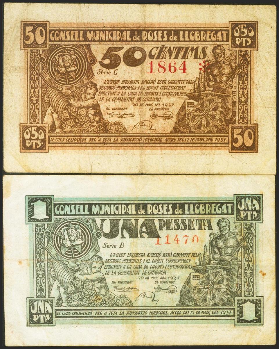 ROSES DE LLOBREGAT (BARCELONA). 50 Céntimos y 1 Peseta. 20 de Mayo de 1937. Series C y B, respectivamente. (González: 9752, 9753). MBC.
