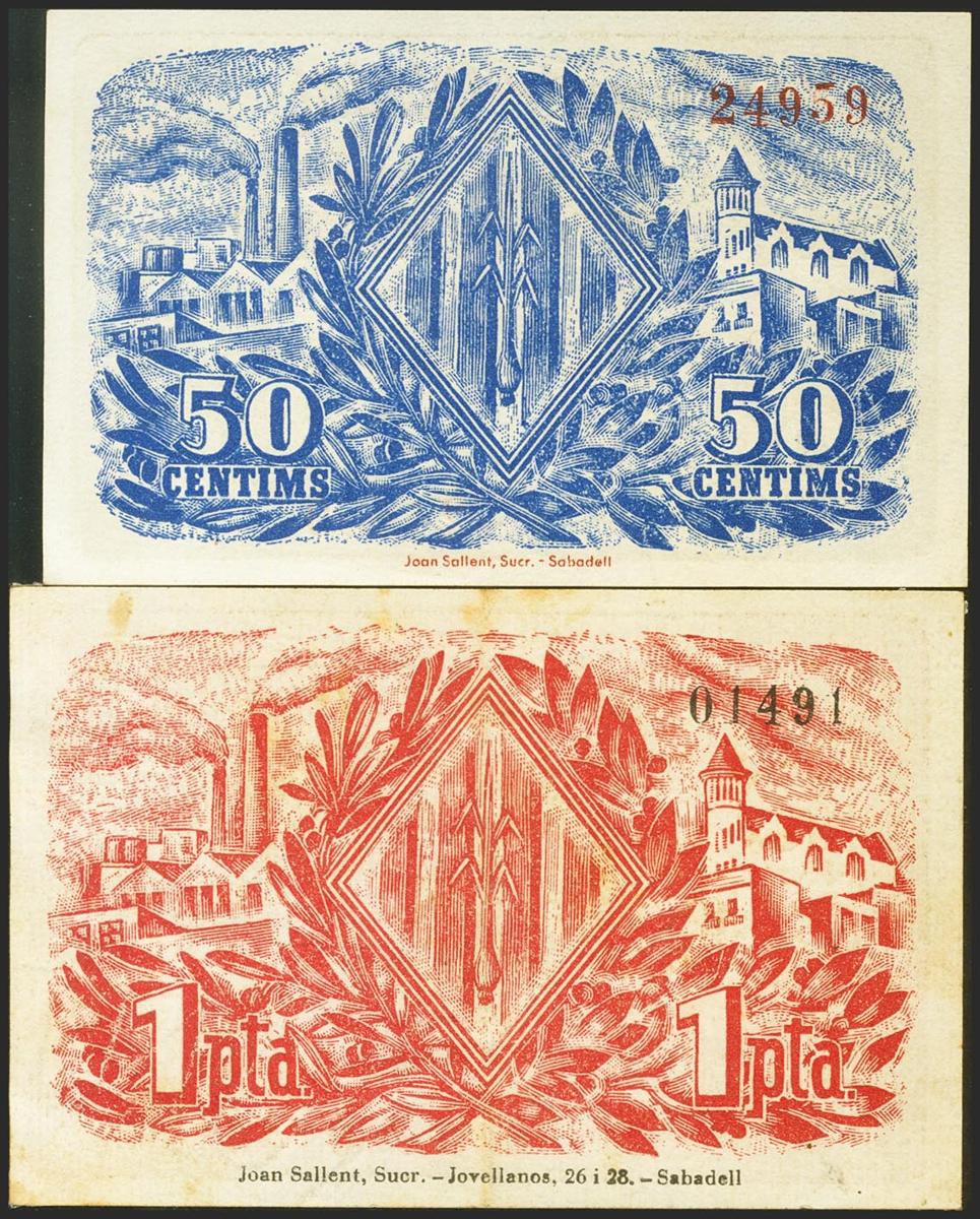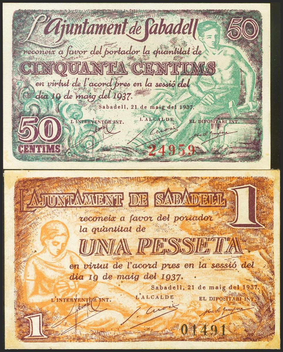 SABADELL (BARCELONA). 50 Céntimos y 1 Peseta. 19 de Mayo de 1937. (González: 9776/77). Inusual serie completa. MBC+/EBC.