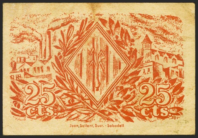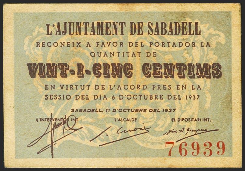 SABADELL (BARCELONA). 25 Céntimos. 11 de Octubre de 1937. (González: 9778). EBC.