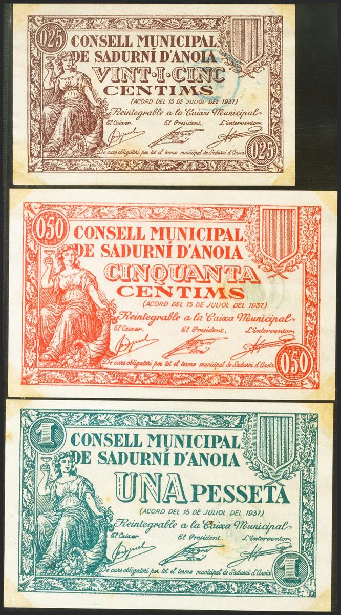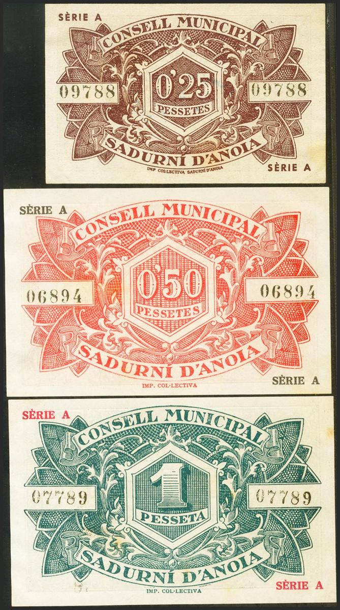 SADURNI D´ANOIA (BARCELONA). 25 Céntimos, 50 Céntimos y 1 Peseta. 15 de Julio de 1937. Serie A, los tres billetes. (González: 9804/06). Inusual serie completa. EBC