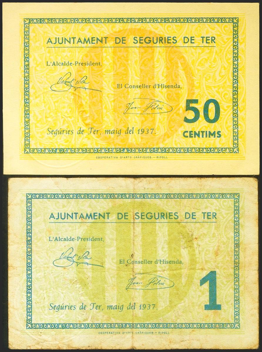 SEGURIES DE TER (GERONA). 50 Céntimos y 1 Peseta. Mayo 1937. (González: 9915/16). Rara serie completa. EBC+/MBC.