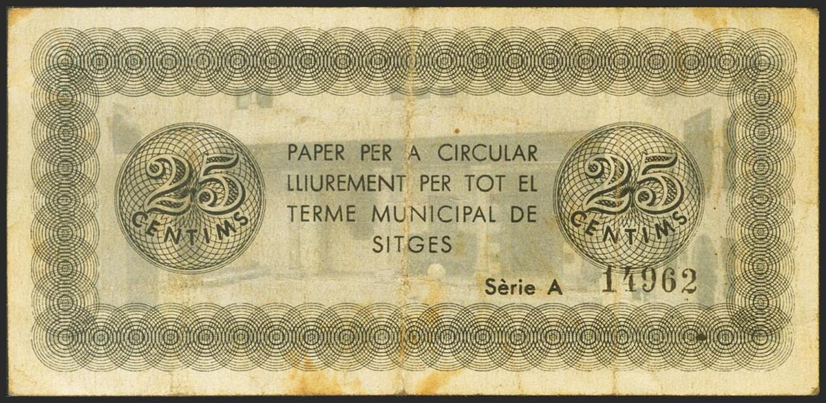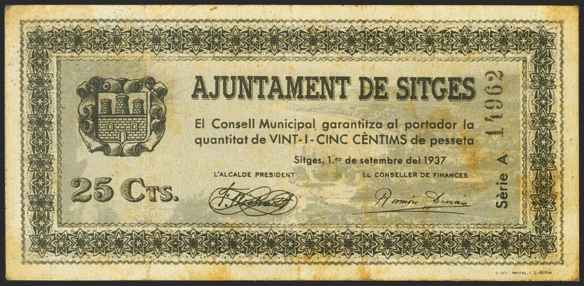 SITGES (BARCELONA). 25 Céntimos. 1 de Septiembre de 1937. Serie A. (González: 10015). MBC.
