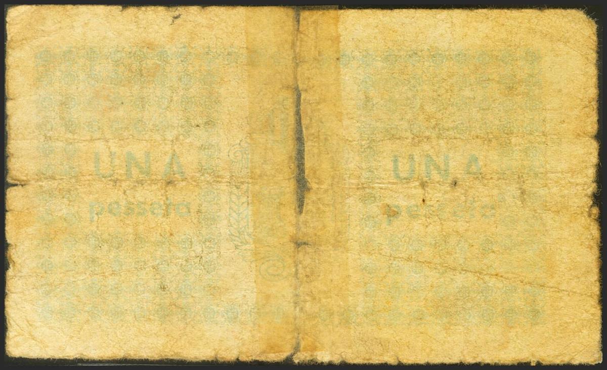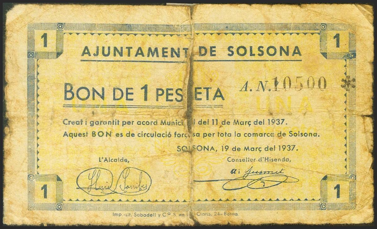 SOLSONA (LERIDA). 1 Peseta. 19 de Marzo de 1937. Serie A. (González: 10036). Unido mediante fijasellos. RC-.