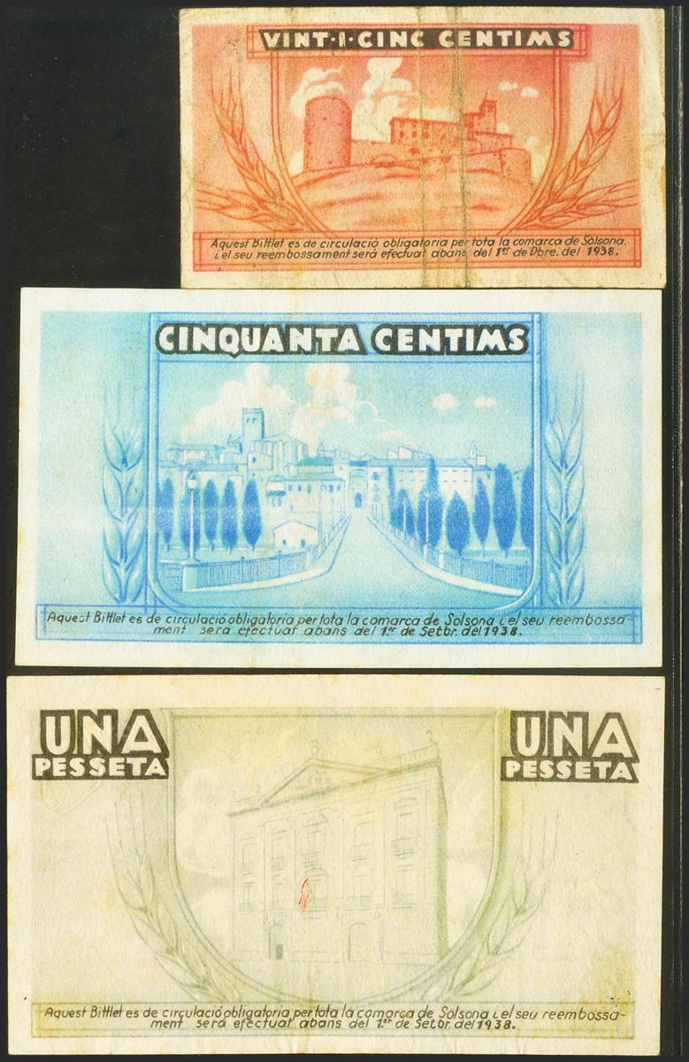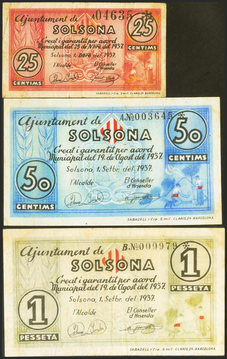 SOLSONA (LERIDA). 25 Céntimos, 50 Céntimos y 1 Peseta, emitidos el 1 de Septiembre de 1937 y 1 de Diciembre de 1937, respectivamente. Series A, A y B, respectivamente. (González: 10037, 10039, 10040). MBC+.