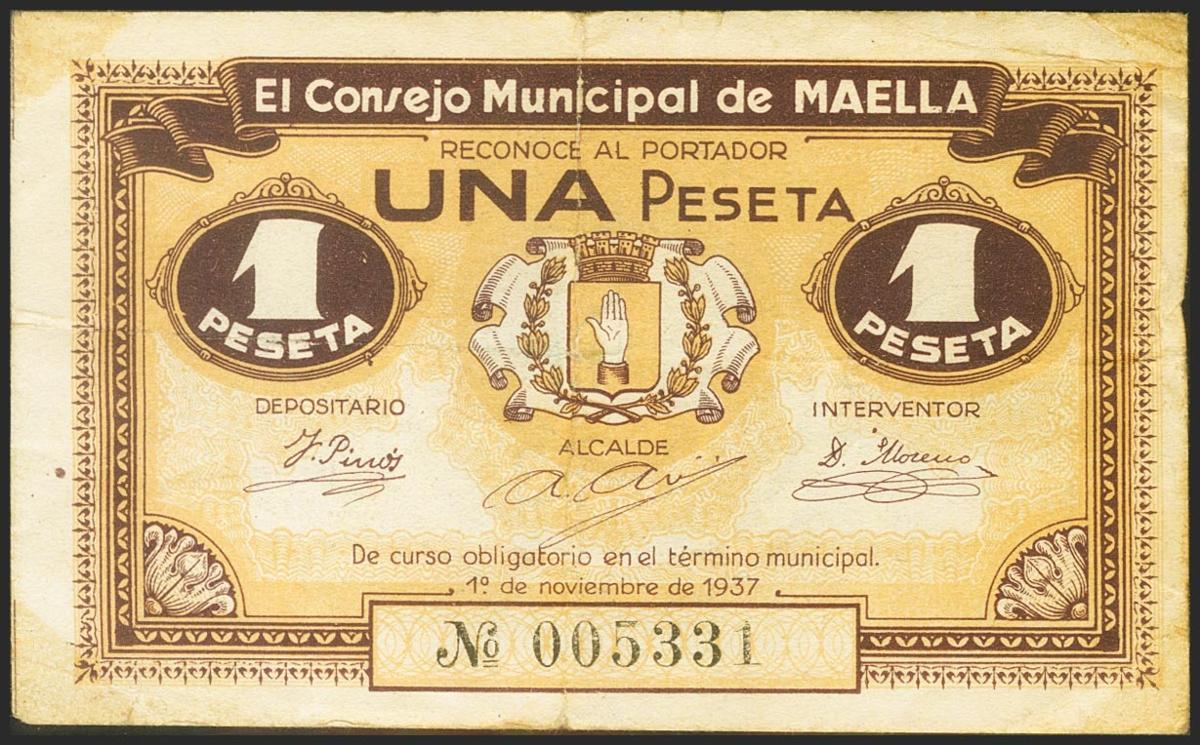 MAELLA (ZARAGOZA). 1 Peseta. 1 de Noviembre de 1937. (González: 3313). Inusual. MBC.