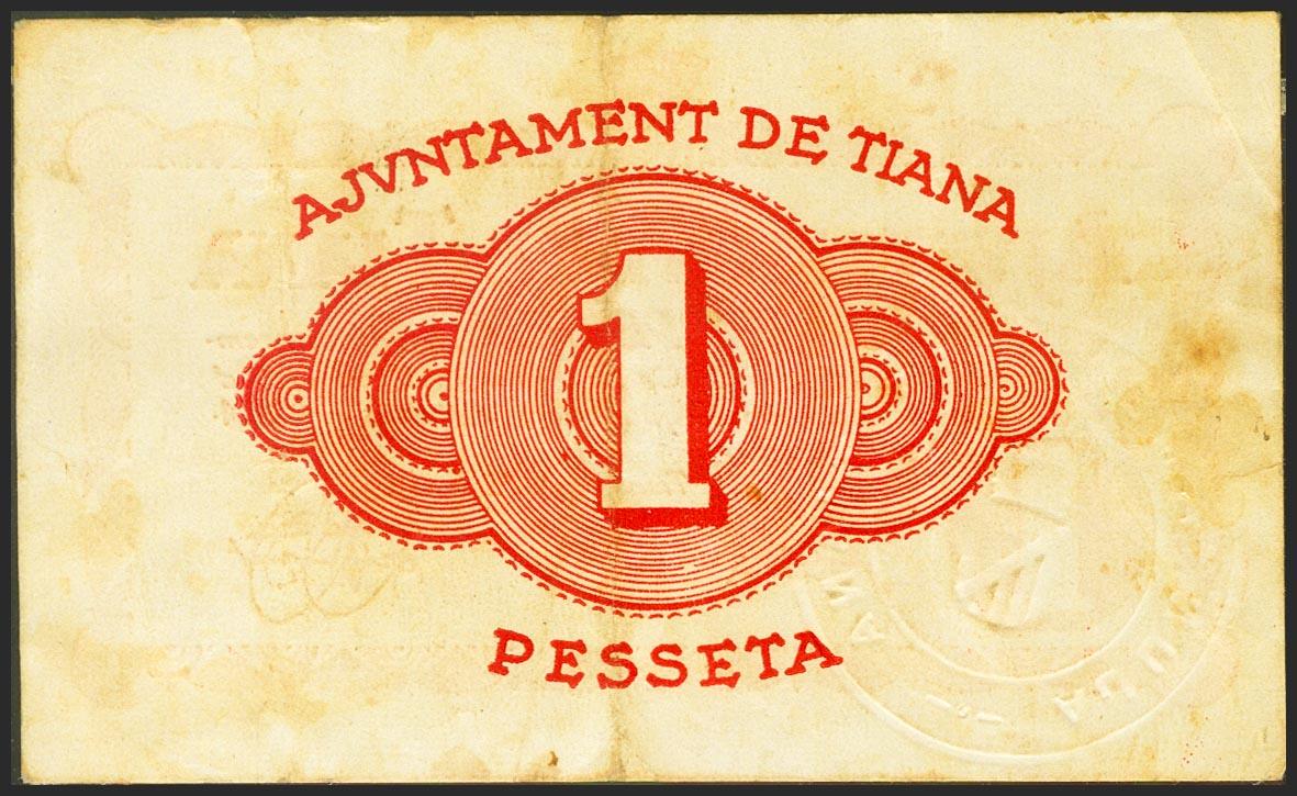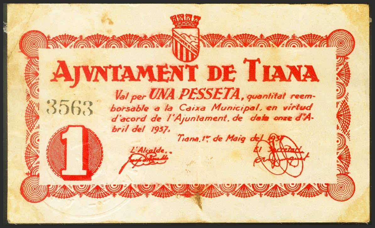 TIANA (BARCELONA). 1 Peseta. 1 de Mayo de 1937. (González: 10256). Raro. MBC+.