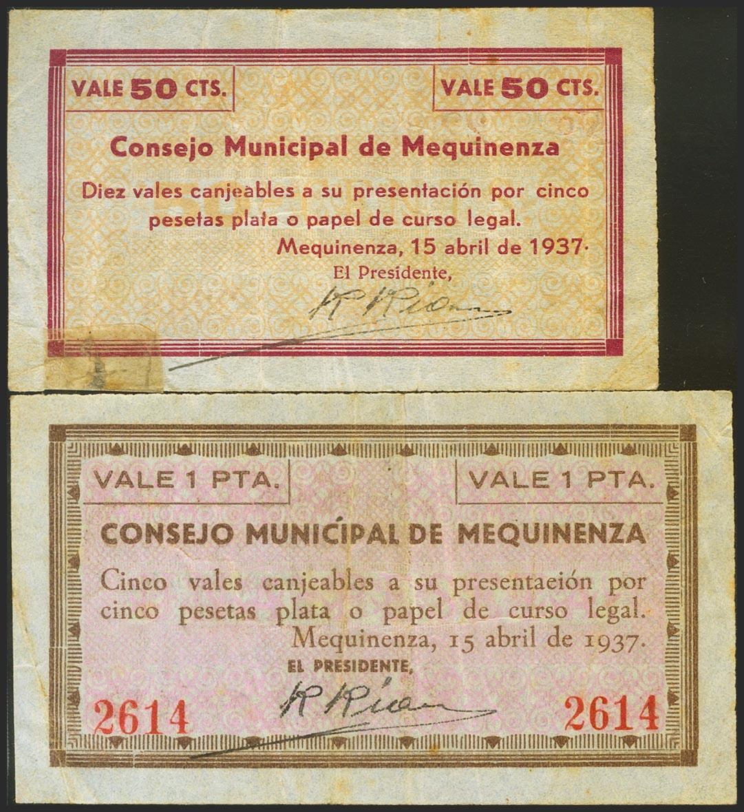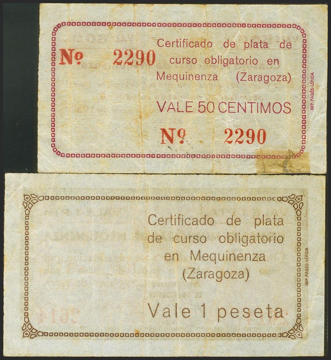 MEQUINENZA (ZARAGOZA). 50 Céntimos y 1 Peseta. 15 de Abril de 1937. (González: 3493, 3494). Raros. MBC/MBC+.