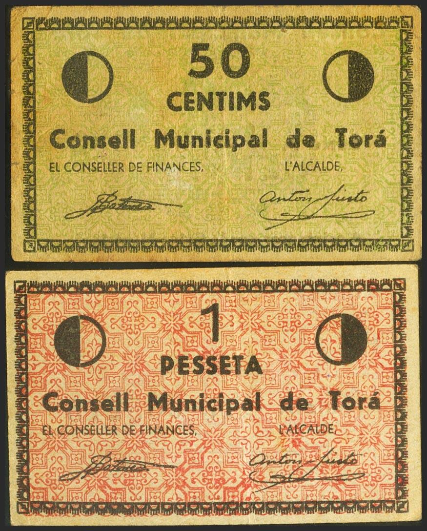 TORA DE RIUBREGOS (LERIDA). 50 Céntimos y 1 Peseta. (1936ca). Serie A, ambos. (González: 10297/98). Inusual serie completa. MBC+.