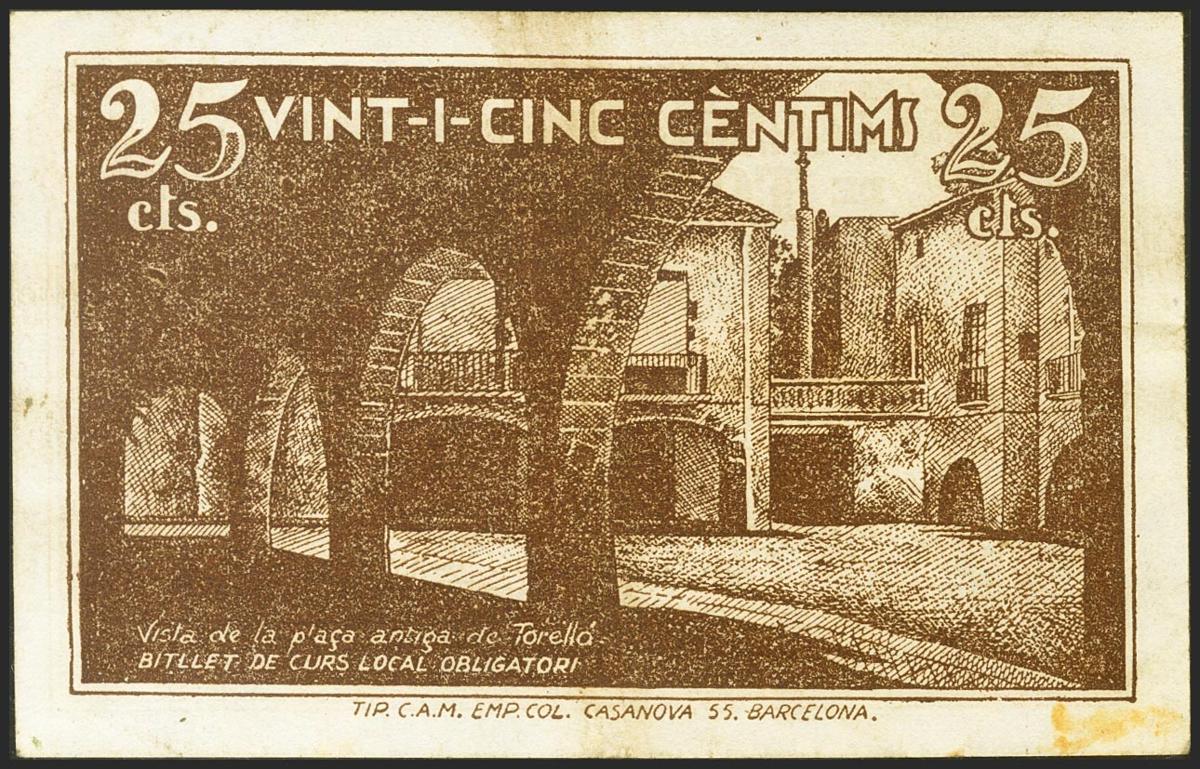 TORELLO (BARCELONA). 25 Céntimos. 15 de Julio de 1937. (González: 10310). EBC.
