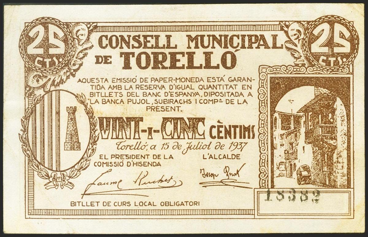 TORELLO (BARCELONA). 25 Céntimos. 15 de Julio de 1937. (González: 10310). EBC.