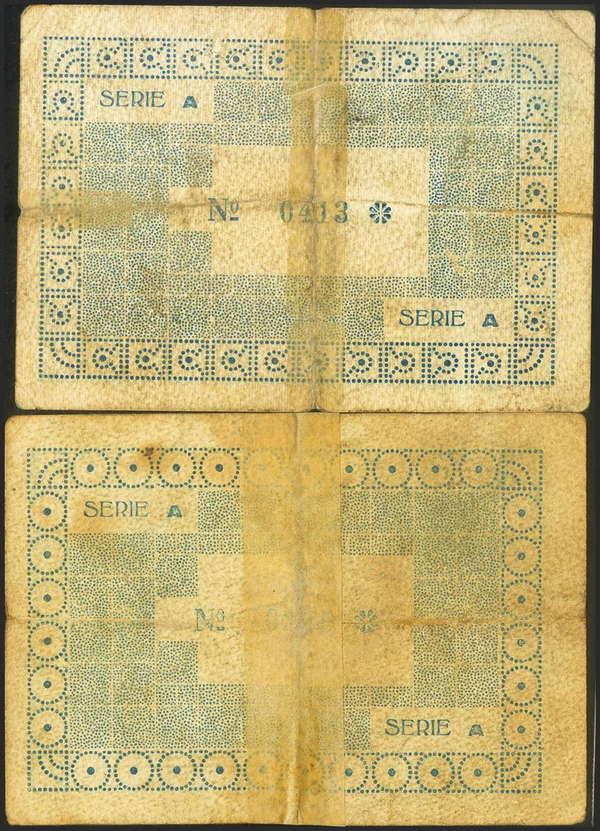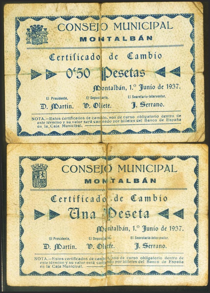 MONTALBAN (TERUEL). 50 Céntimos y 1 Peseta. 1 de Junio de 1937. Serie A, ambos. (González: 3618/19). Muy rara serie completa. MBC-.
