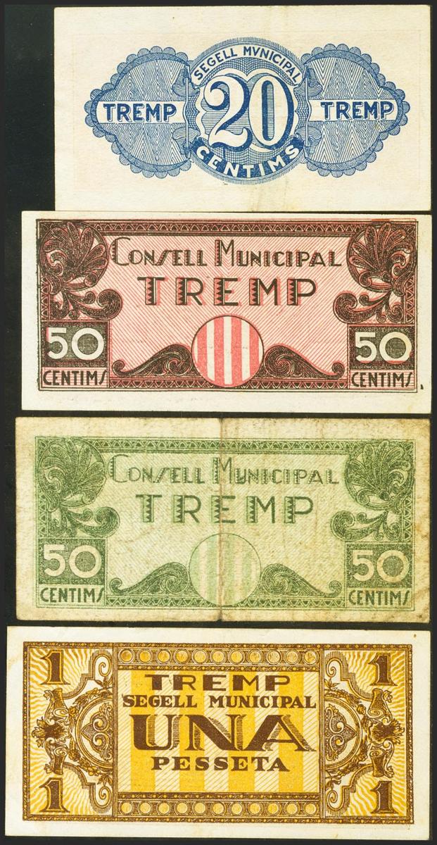 TREMP (LERIDA). 20 Céntimos, 50 Céntimos (dos billetes, rosa y verde) y 1 Peseta. (1936ca). (González: 10439, 10440, 10441, 10443). MBC/EBC.