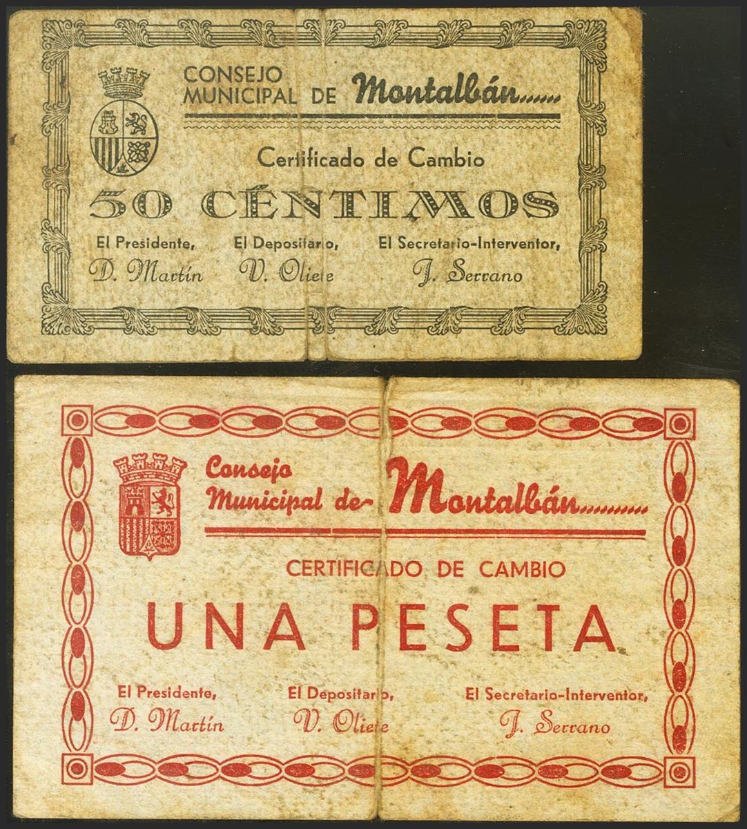 MONTALBAN (TERUEL). 50 Céntimos y 1 Peseta. 1 de Junio de 1937. (González: 3620/21). Rara serie completa. MBC.