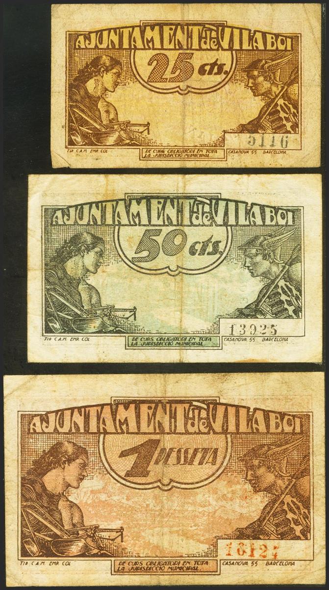 VILABOI (BARCELONA). 25 Céntimos, 50 Céntimos y 1 Peseta. 19 de Mayo de 1937. (González: 10679/81). Serie completa. MBC.
