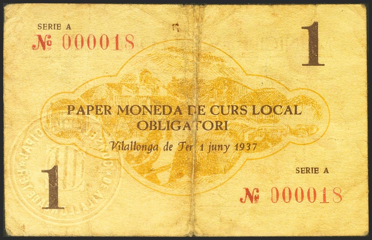 VILALLONGA DE TER (GERONA). 1 Peseta. Serie A y numeración bajísima 000018. (1936ca). (González: 10754). Raro. MBC.