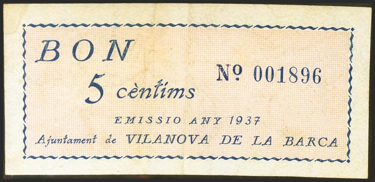 VILANOVA DE LA BARCA (LERIDA). 5 Céntimos. (1937ca). (González: 10797). Muy raro. MBC+.