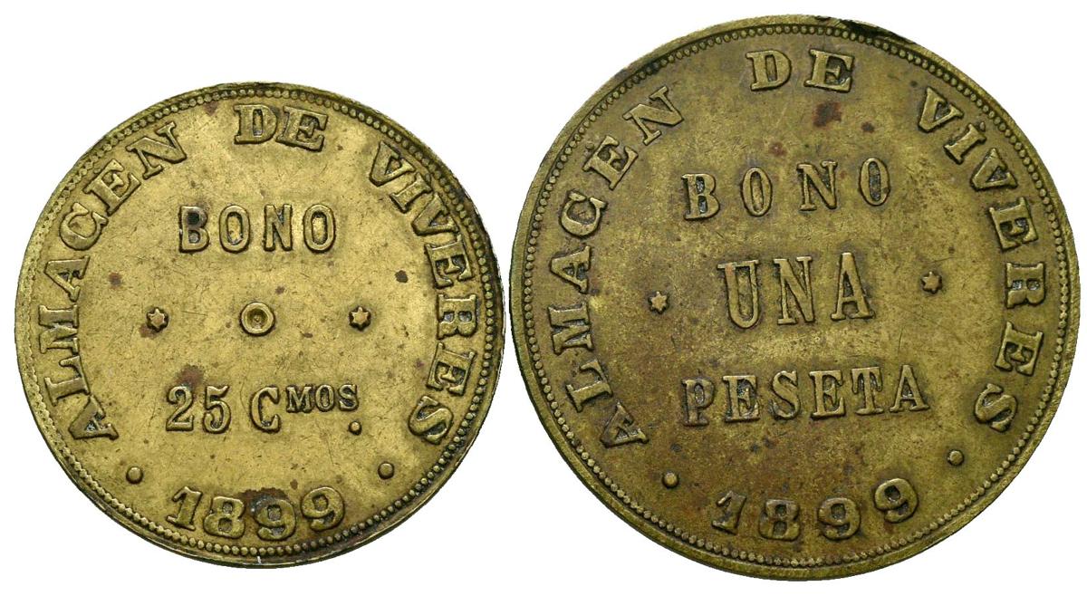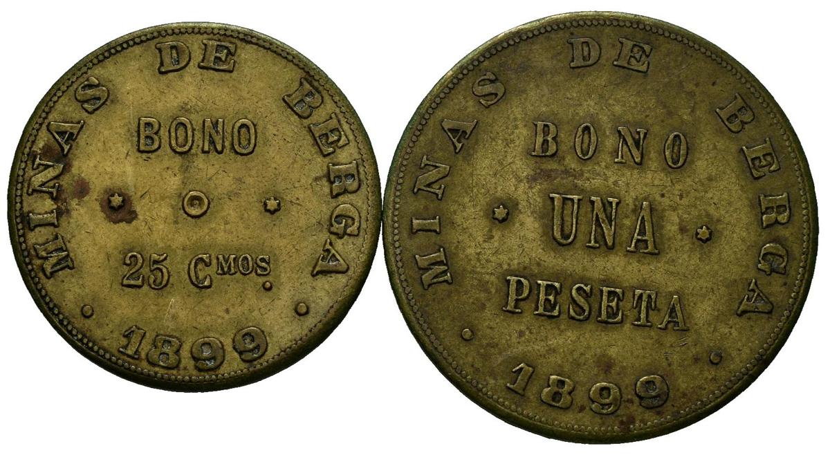 BERGA (BARCELONA). 25 Céntimos y 1 Peseta. (1899ca). Minas de Berga, Almacén de Víveres. MBC+.