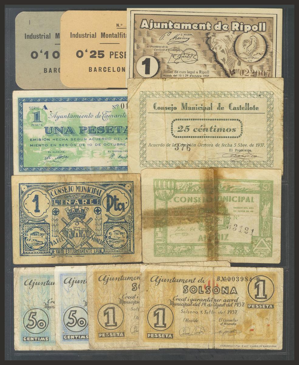 Conjunto de 18 billetes de la Guerra Civil de diferentes localidades en diversas calidades, 3 letras de cambio y una acción nominal "Domingo Nieto". A EXAMINAR.