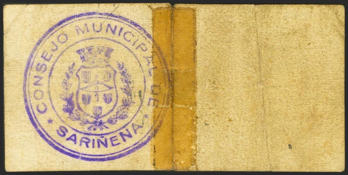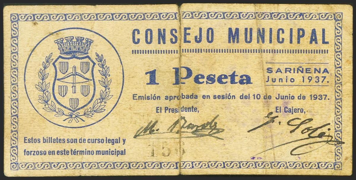 SARIÑENA (HUESCA). 1 Peseta. 10 de Junio de 1937. (González: 4786). Presencia de cinta adhesiva. MBC-.