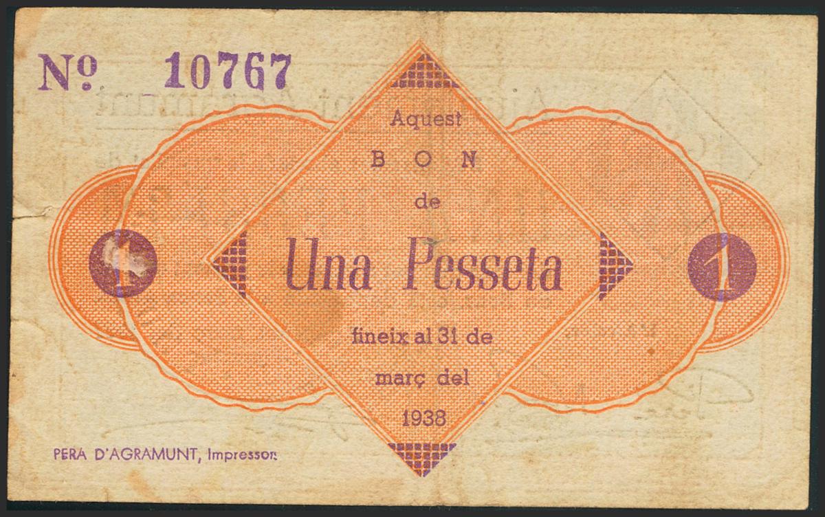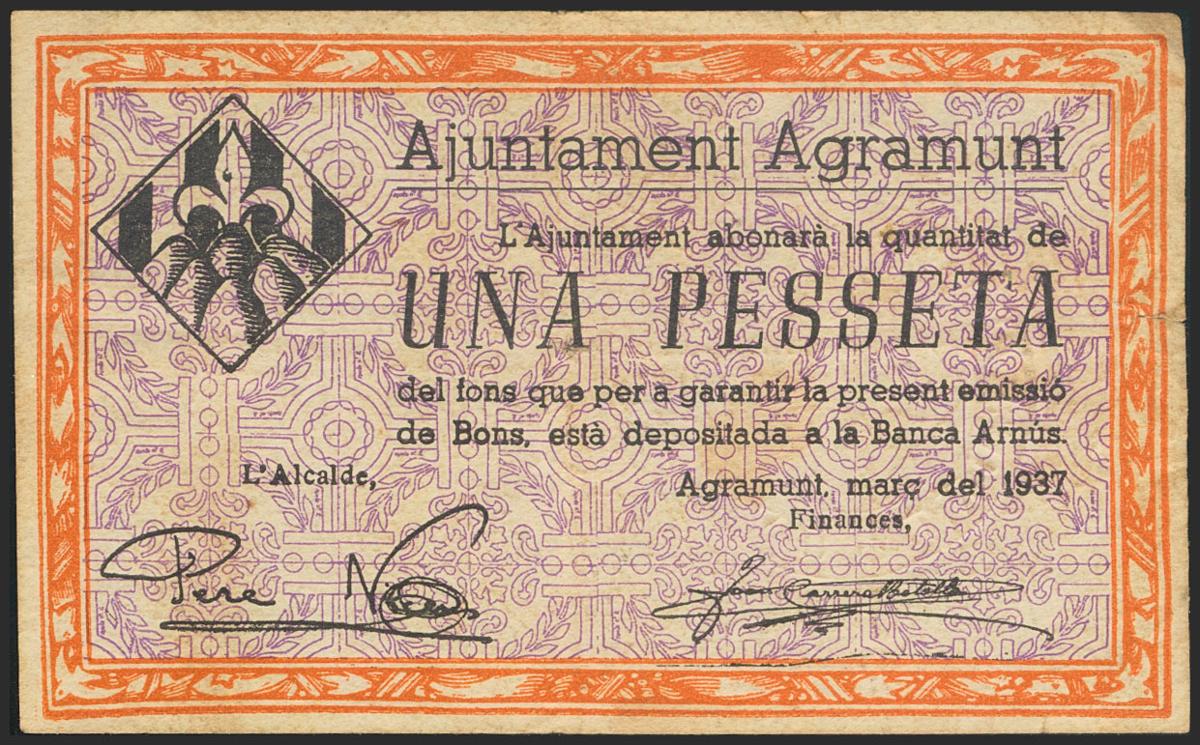 AGRAMUNT (LERIDA). 1 Peseta. Marzo 1937. (González: 6013). EBC.