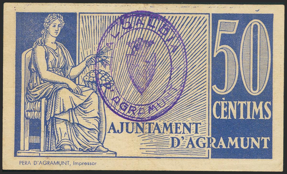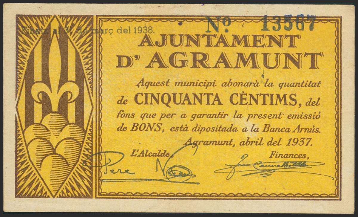 AGRAMUNT (LERIDA). 50 Céntimos. Septiembre 1937. (González: 6014). Inusual. EBC.