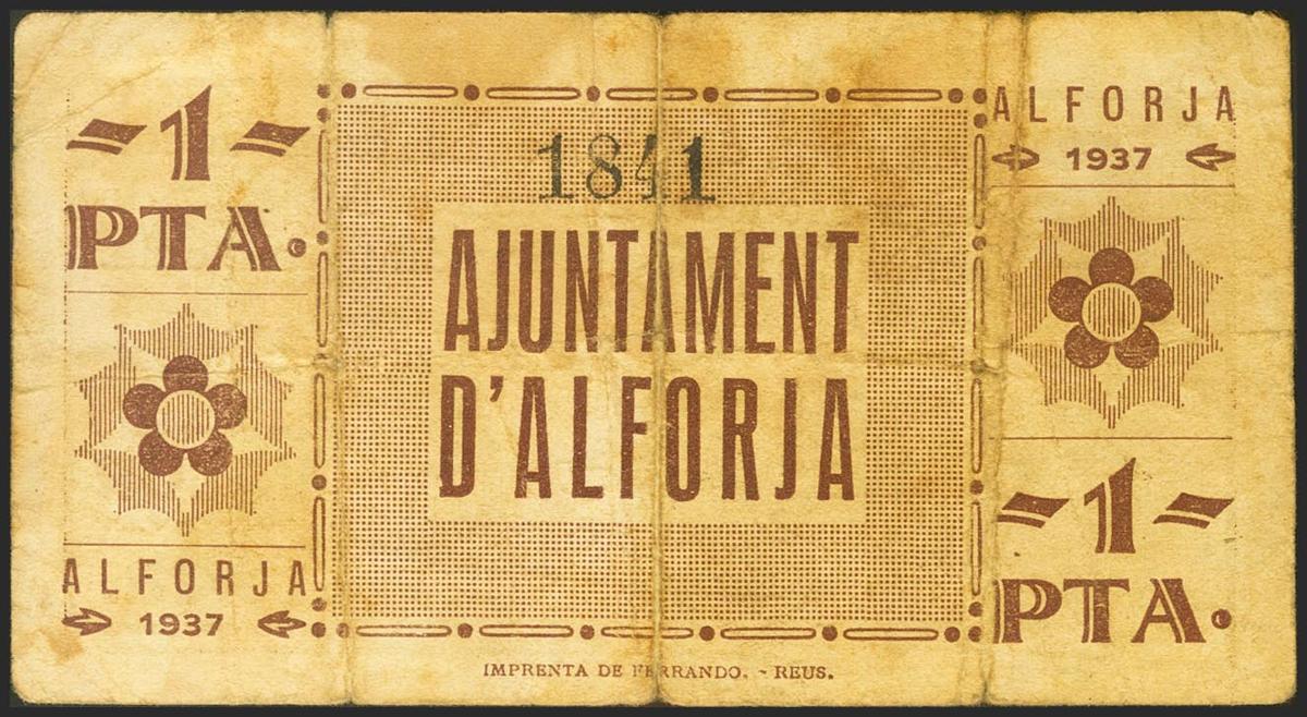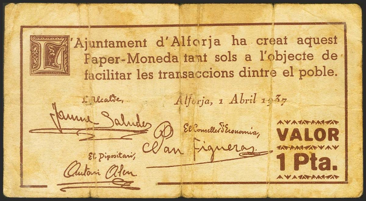 ALFORJA (TARRAGONA). 1 Peseta. 1 de Abril de 1937. (González: 6179). MBC-.