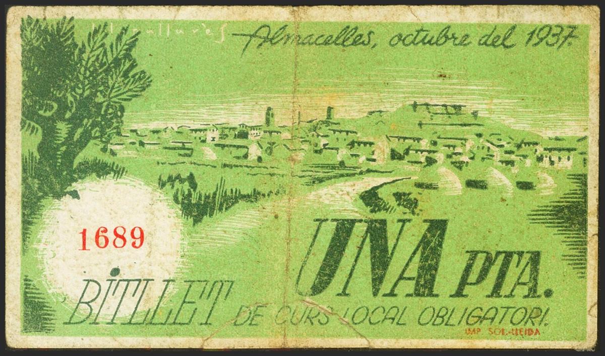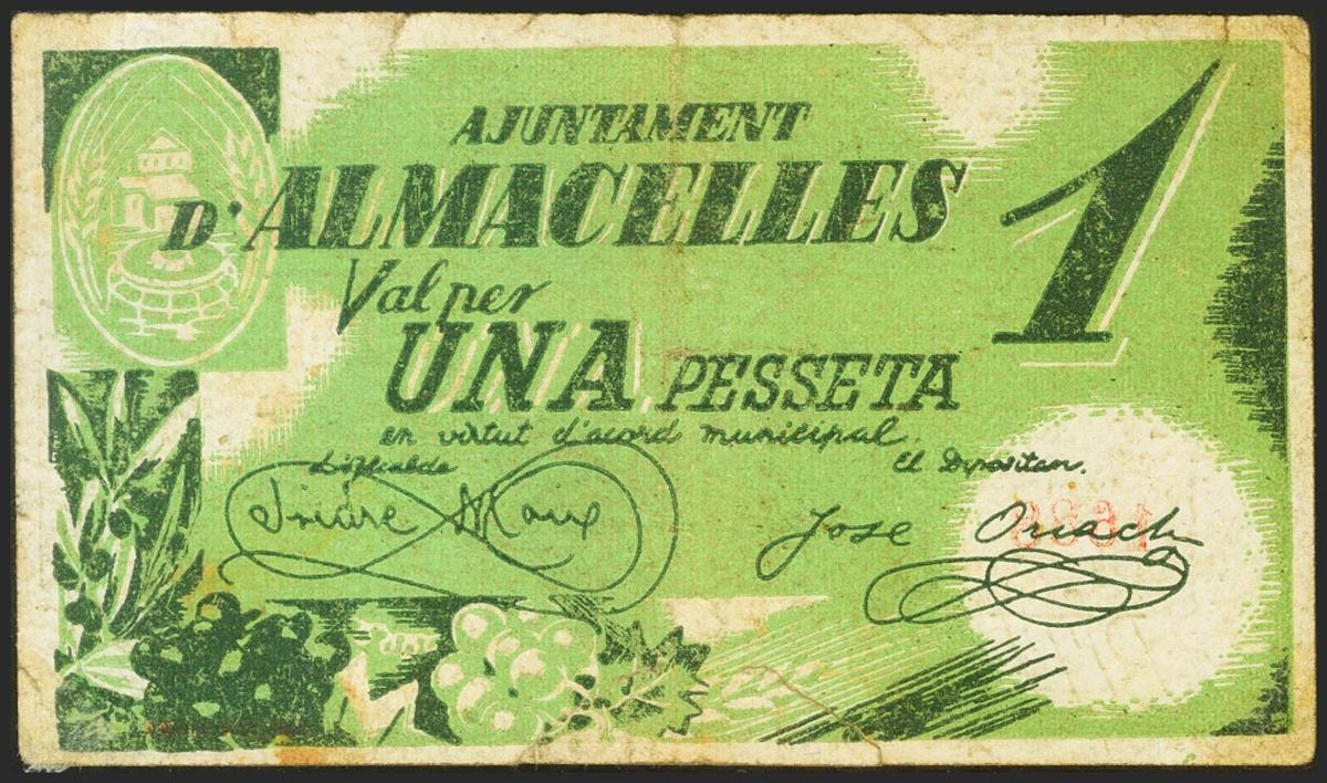 ALMACELLES (LERIDA). 1 Peseta. Octubre 1937. (González: 6209). MBC.