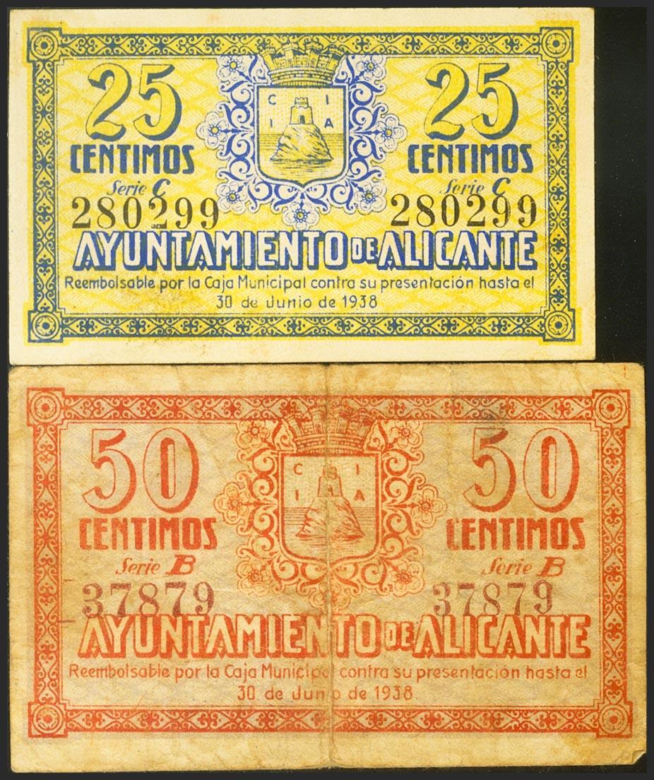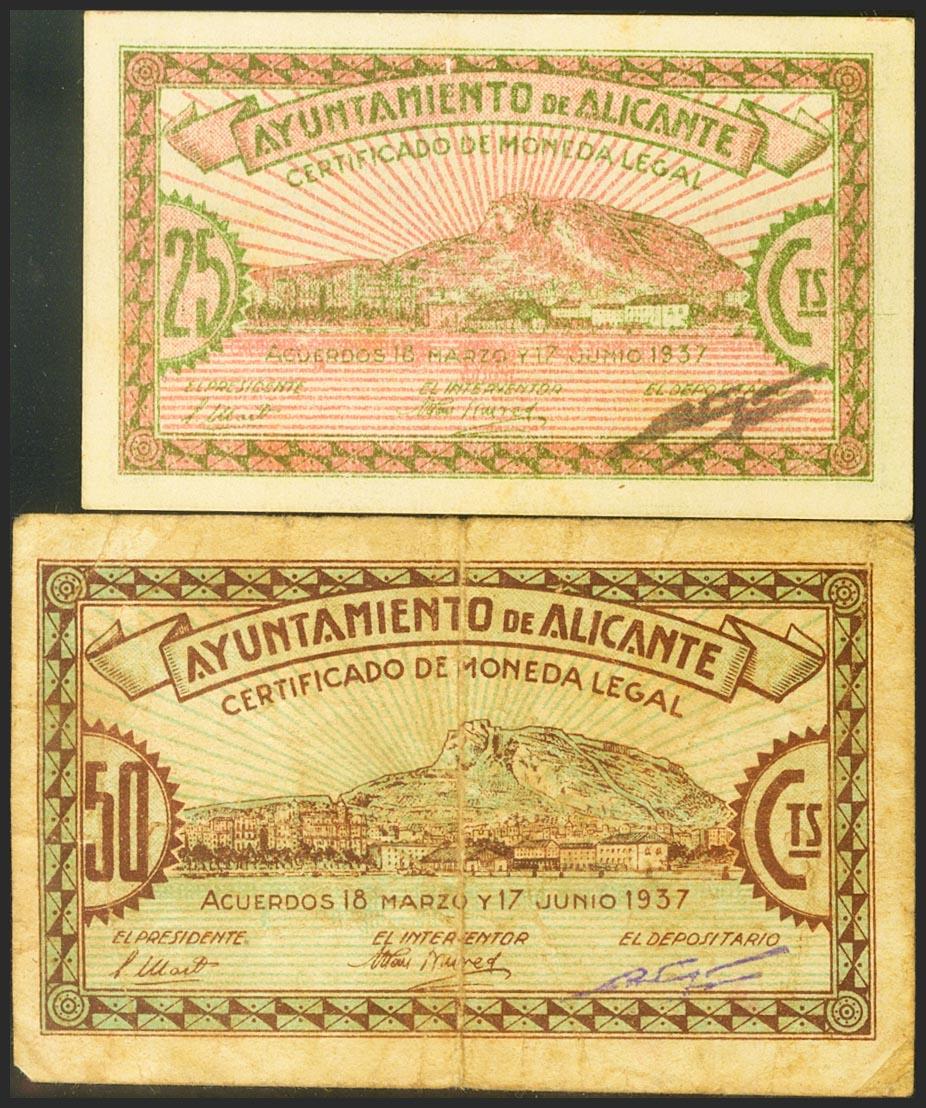ALICANTE. 25 Céntimos y 50 Céntimos. 17 de Junio de 1937. Serie C y B, respectivamente. (González: 508, 509). MBC-/MBC+.