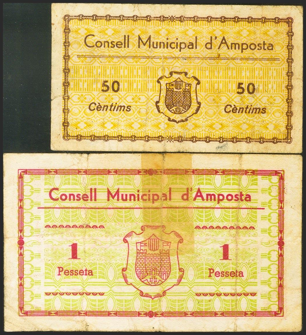 AMPOSTA (TARRAGONA). 50 Céntimos y 1 Peseta. 1 de Junio de 1937. Series B y A, respectivamente. (González: 6275/76). MBC+/MBC-.