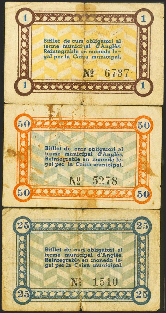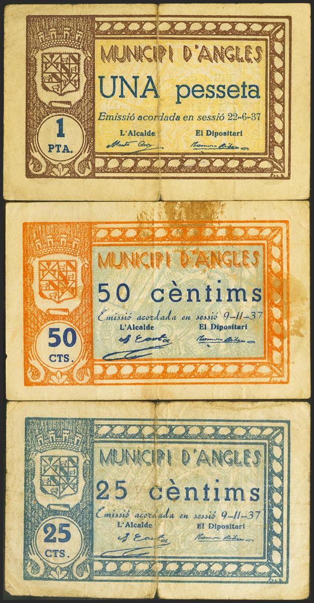ANGLES (GERONA). 25 Céntimos, 50 Céntimos y 1 Peseta. 22 de Junio de 1937. (González: 6289/91). Inusual serie completa. MBC/MBC-.