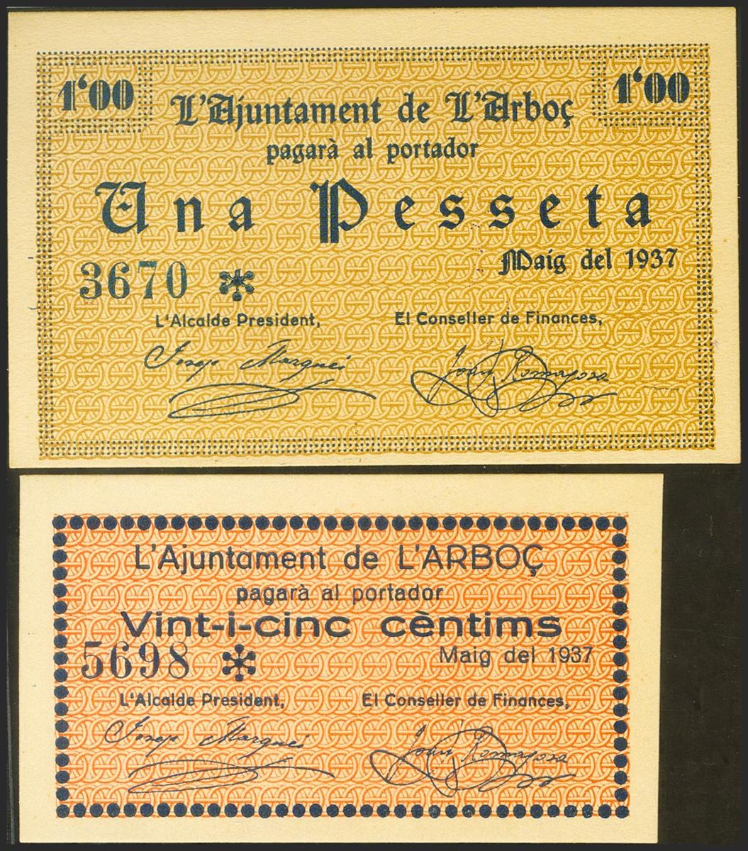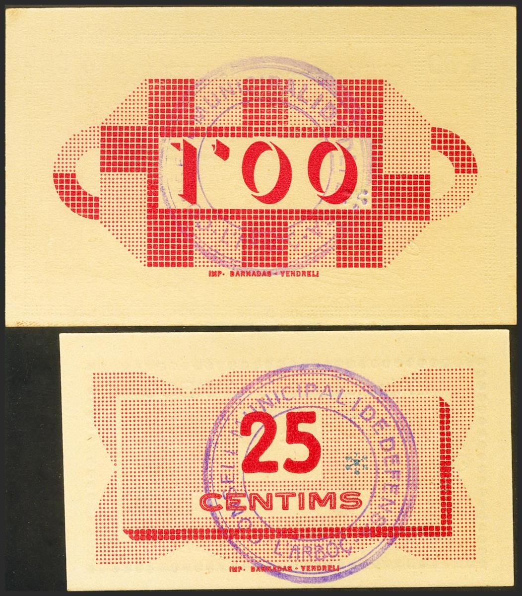 L´ARBOC (TARRAGONA). 25 Céntimos y 1 Peseta. Mayo 1937. (González: 6314, 6316). EBC.