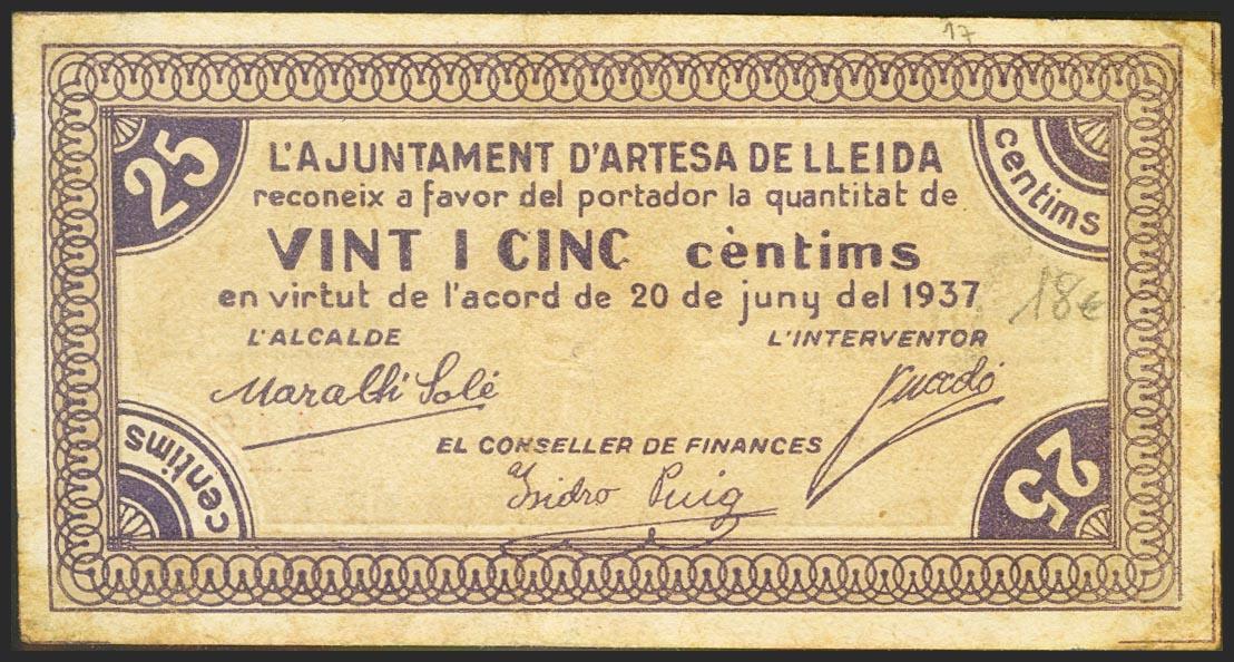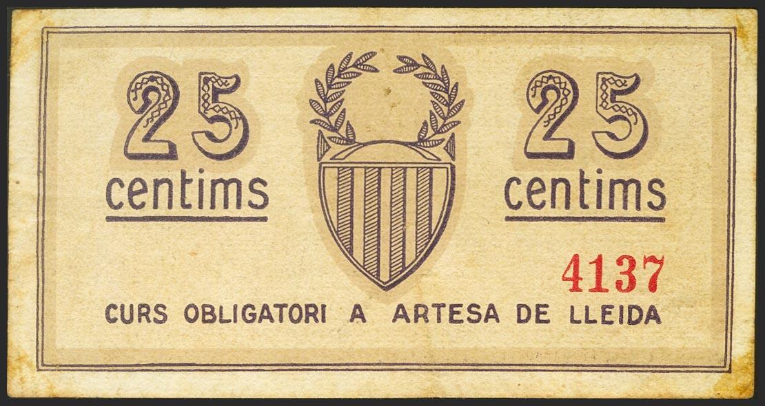 ARTESA DE LLEIDA (LERIDA). 25 Céntimos. 20 de Junio de 1937. (González: 6423). MBC+.
