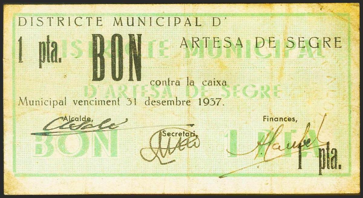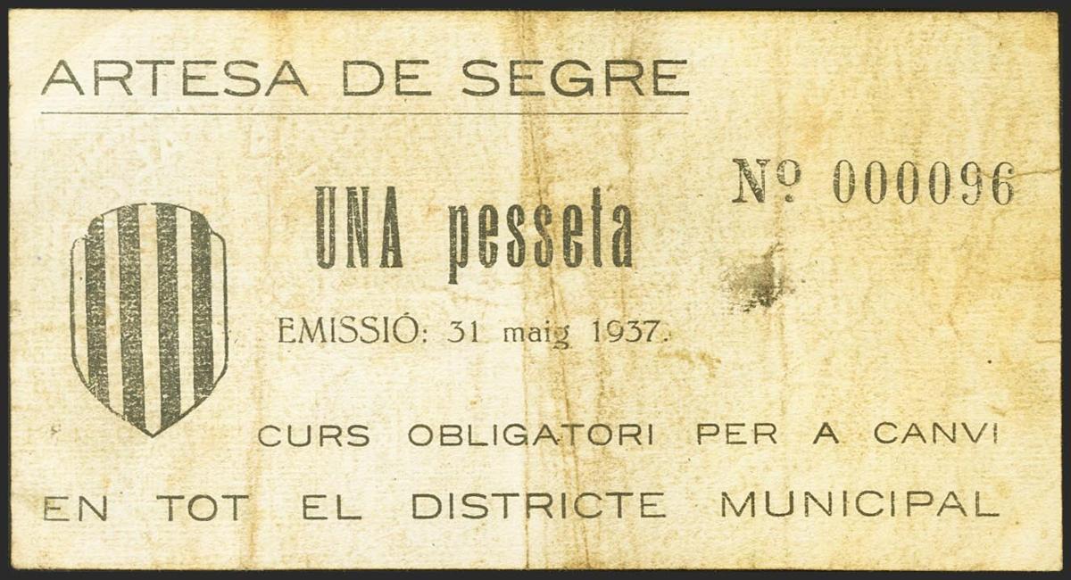 ARTESA DE SEGRE (LERIDA). 1 Peseta. 31 de Mayo de 1937. (González: 6432). Inusual. MBC.