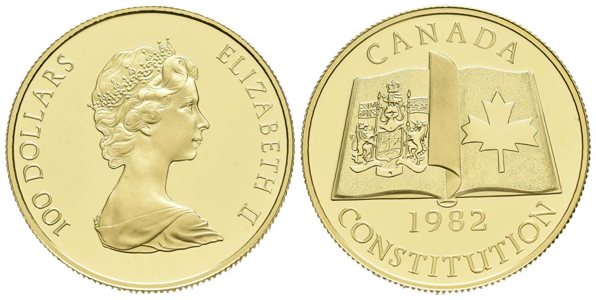 CANADA. 100 Dollars. (Au. 16,90g/25mm). 1982. 25 Constitución Canadiense. (Km#137). PROOF.