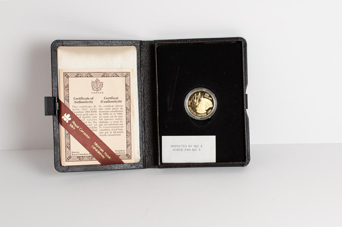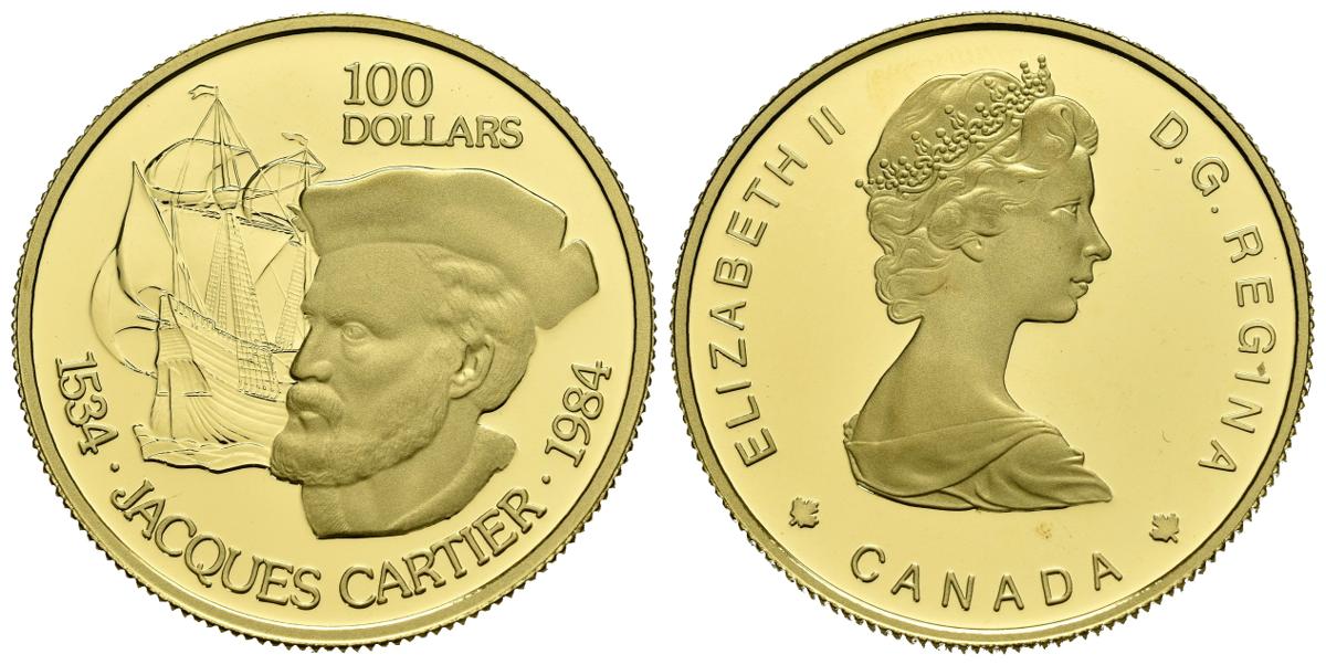 CANADA. 100 Dollars. (Au. 16,96g/27mm). 1984. Jacques Cartier. (Km#142). PROOF. Incluye certificado de autenticidad y estuche original.