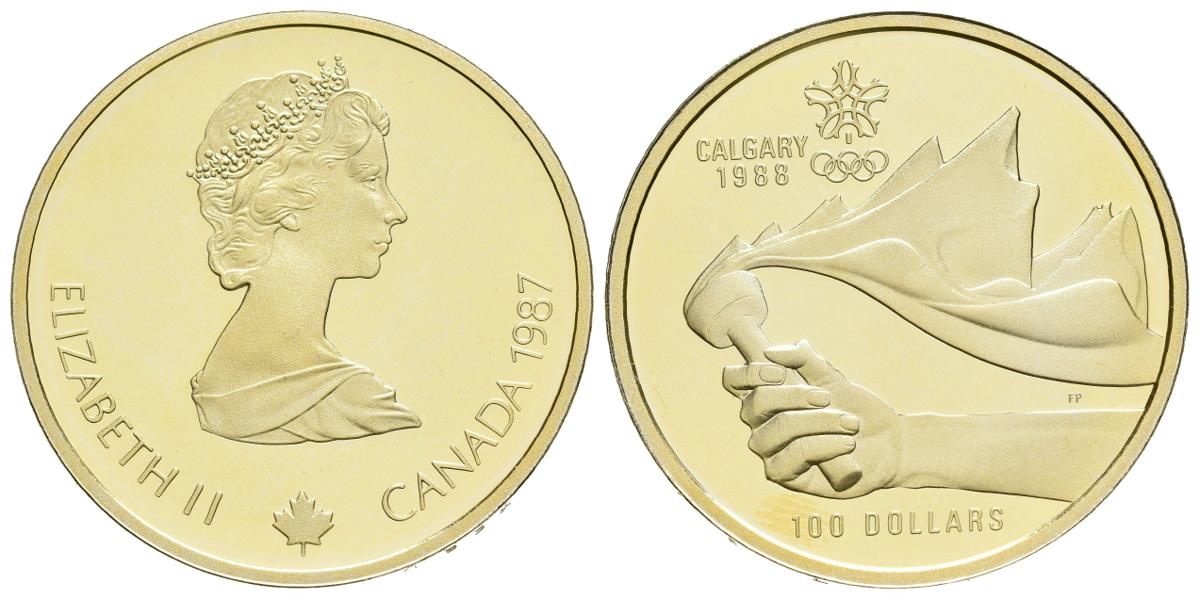 CANADA. 100 Dollars. (Au-Ar. 13,19g/27mm). 1987. Olimpiadas Cagliari 1988. (Km#158). PROOF. Composición en oro 58,3%.