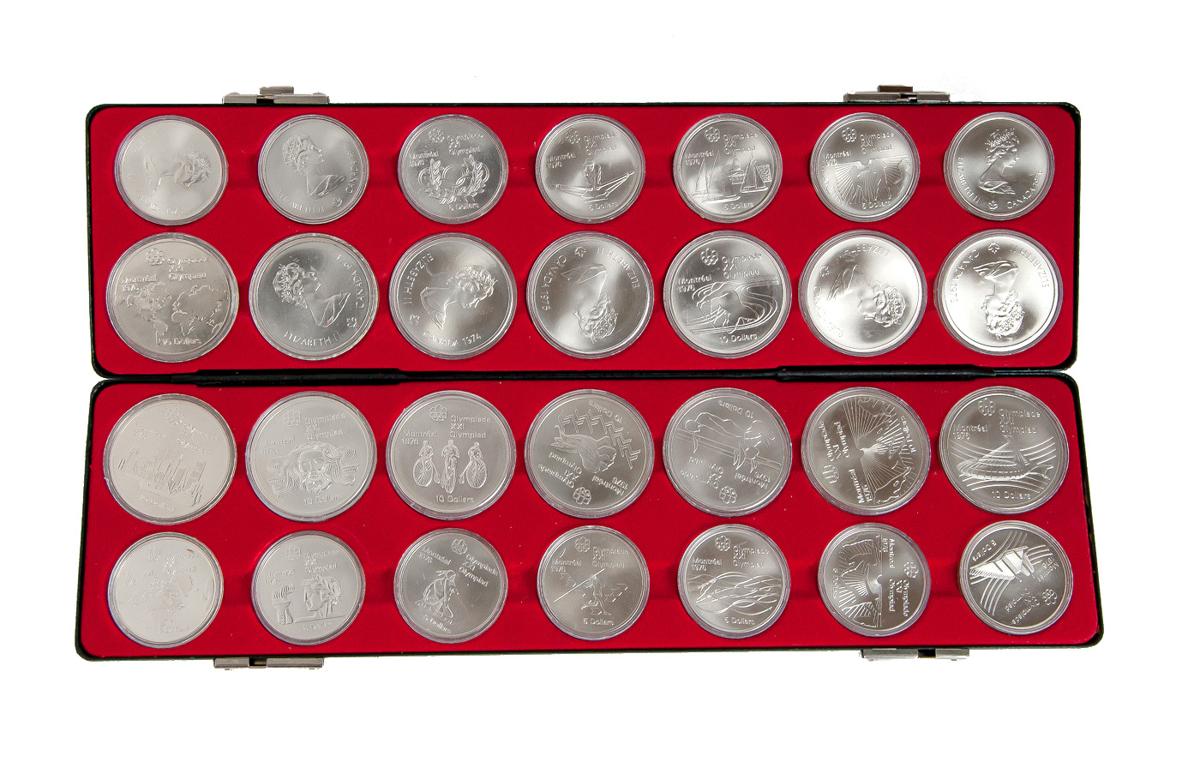 CANADA. Estuche oficial y completo compuesto por 28 monedas de plata conmemorativas de los Juegos Olímpicos de Montreal 1976. Dos módulos diferentes, 5 (14 piezas) y 10 dollars (14 piezas).Peso total en plata: 1020 gramos (peso total plata pura: 943,50g). PROOF. Incluye estuche.