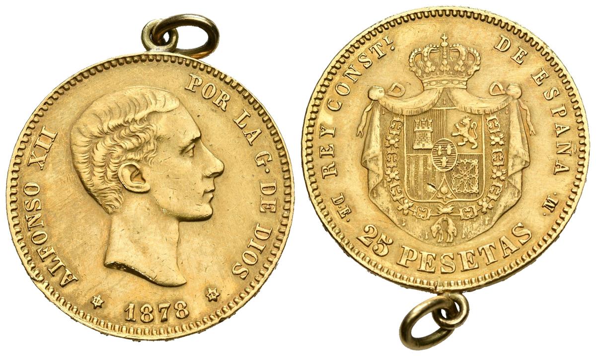 ESPAÑA, Alfonso XII (1874-1885). 25 Pesetas. (Au 8,26g /24mm). 1878 *18-78. Madrid DEM. (Cal-2019-70). MBC+. Colgada.