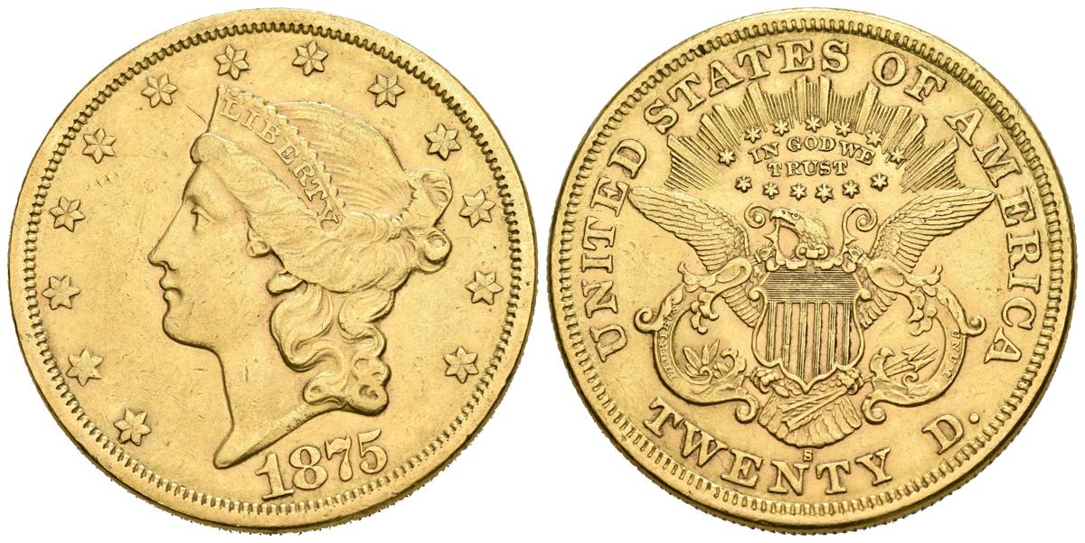 ESTADOS UNIDOS. 20 Dólares. (Au. 33,36g/34mm). 1875. San Francisco S. (Km#74.2). MBC+.