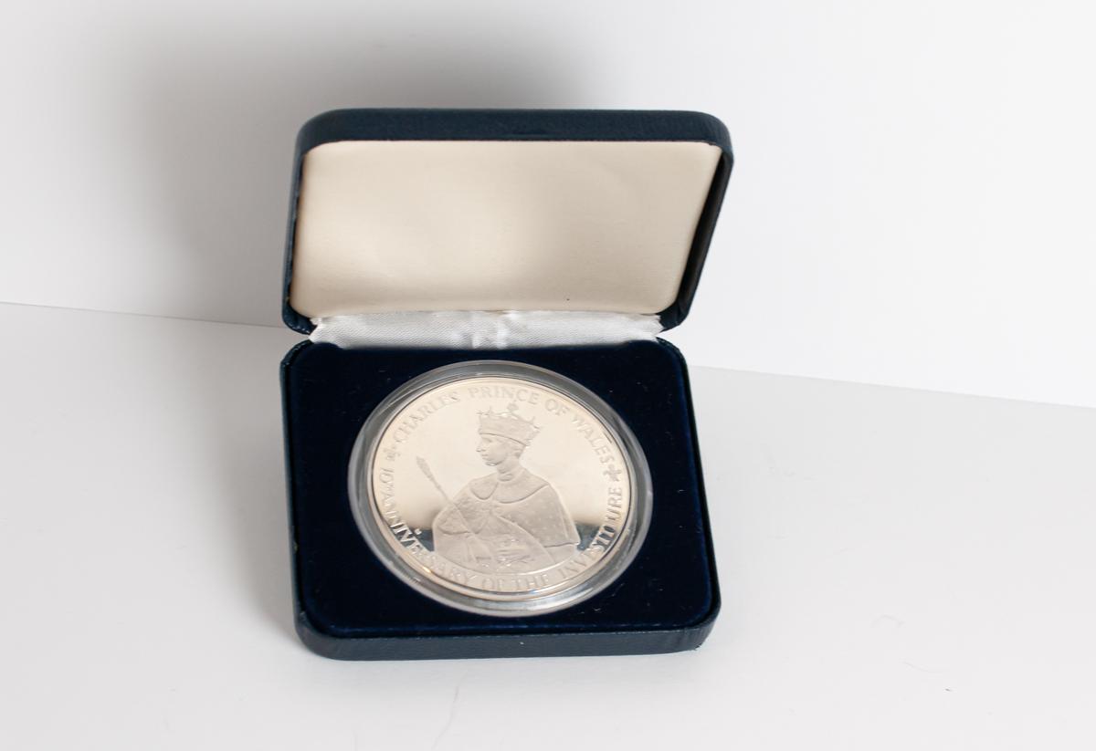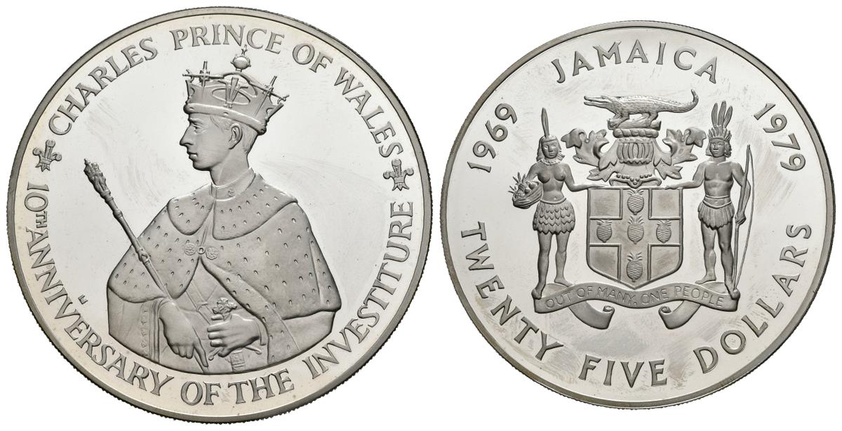 JAMAICA. 25 Dollars (Ar. 136,34g/63mm). 1979. X Aniversario de la Investidura del Príncipe Carlos. (Km#73). PROOF. Incluye estuche y cápsula.