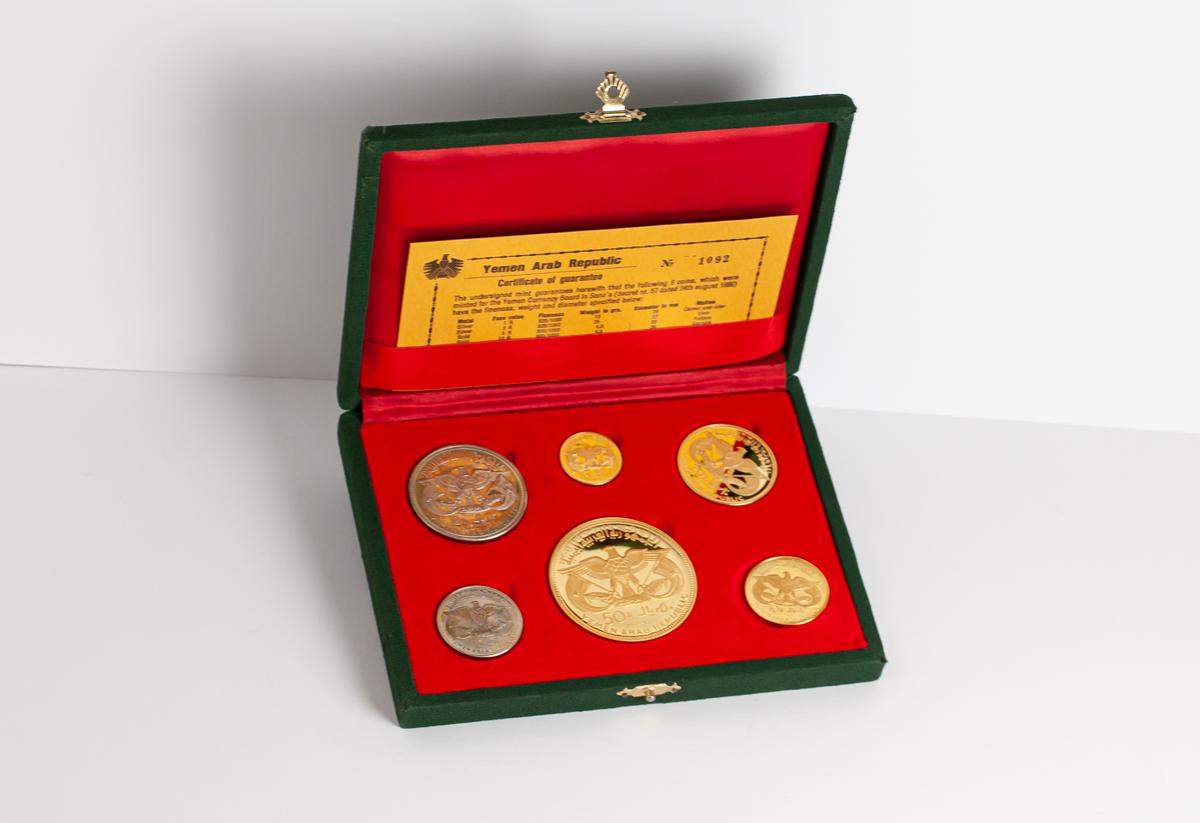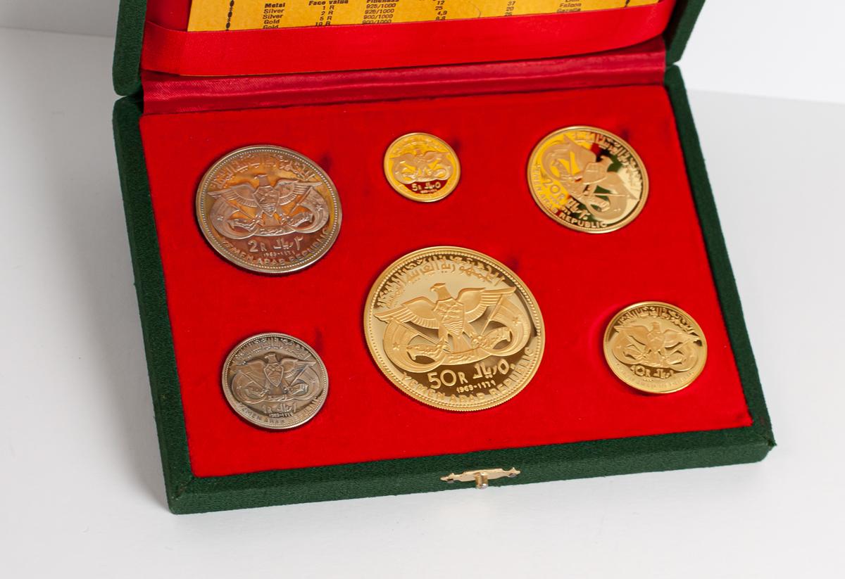 YEMEN. Serie completa por seis monedas con las valores de 1, 2, 5, 10, 20 y 50 Rials. (Peso total: Au. 83,43g; Ar. 37,01g). PROOF. Incluye estuche y certificado original.