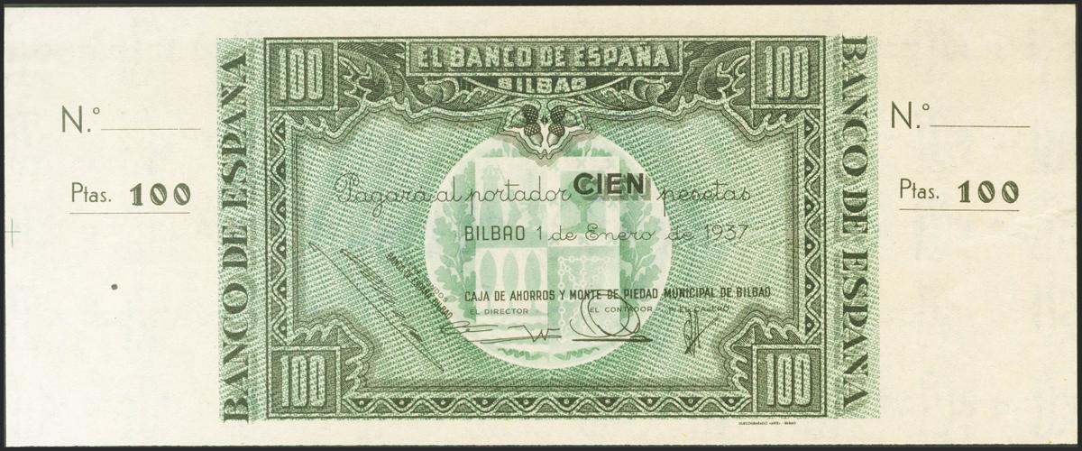 100 Pesetas. 1 de Enero de 1937. Sucursal de Bilbao, antefirma Caja de Ahorros y Monte de Piedad Municipal de Bilbao. Sin serie y sin numeración, con ambas matrices. (Edifil 2021: 390c). EBC+.