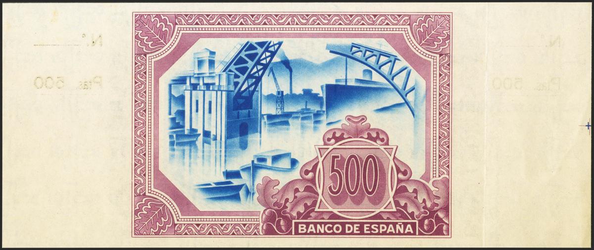 500 Pesetas. 1 de Enero de 1937. Sin serie y con dos matrices. Antefirma Caja de Ahorros y Monte de Piedad Municipal de Bilbao. (Edifil 2021: NE26h). Doblez vertical coincidiendo con una de las matrices. EBC+.