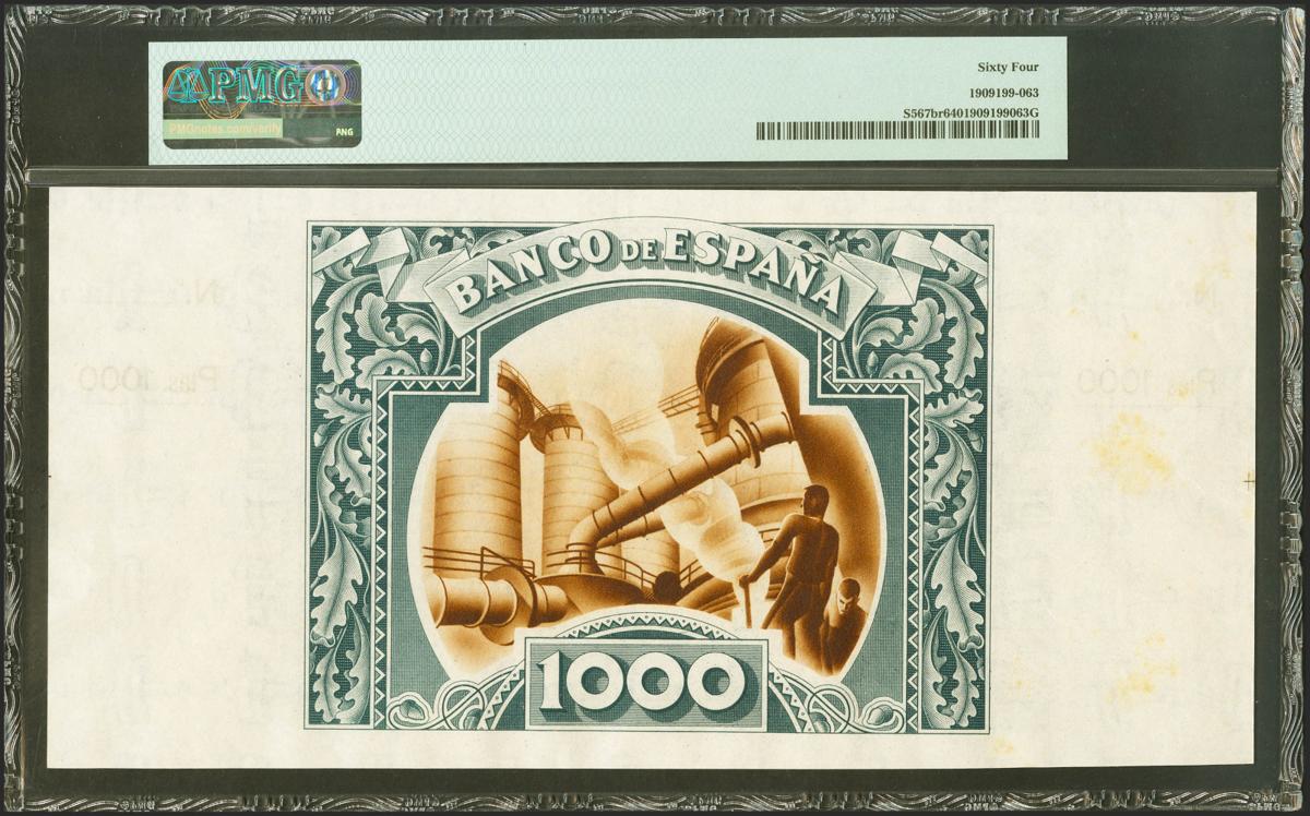 1000 Pesetas. 1 de Enero de 1937. Sucursal de Bilbao, antefirma Banco del Comercio. Sin serie y sin numeración, con ambas matrices. (Edifil 2021: NE27c). SC. Encapsulado PMG64.