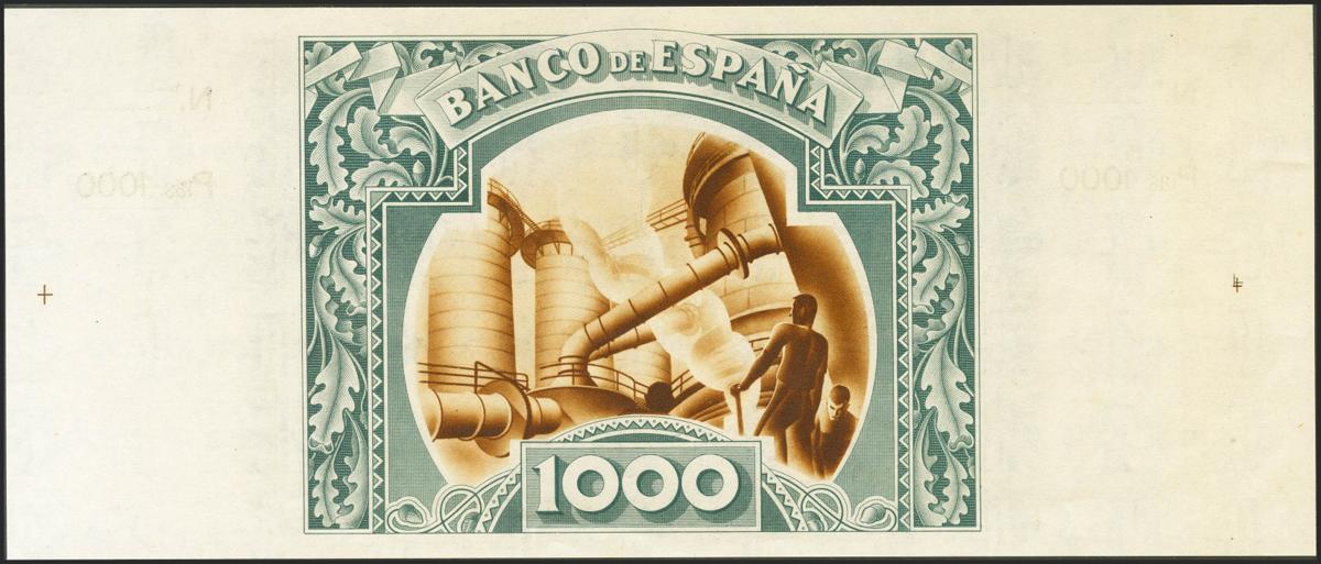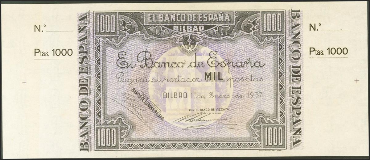 1000 Pesetas. 1 de Enero de 1937. Sucursal de Bilbao, antefirma Banco de Vizcaya. Sin serie y sin numeración, con ambas matrices. (Edifil 2021: NE27g). EBC+.