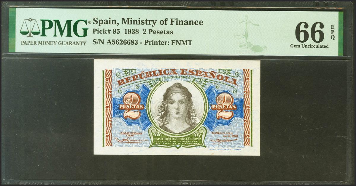2 Pesetas. 1938. Serie A. (Edifil 2021: 393, Pick: 95). Apresto original. Encapsulado PMG66EPQ.