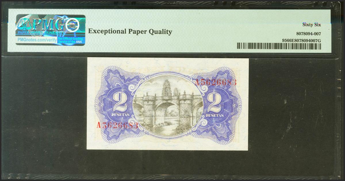 2 Pesetas. 1938. Serie A. (Edifil 2021: 393, Pick: 95). Apresto original. Encapsulado PMG66EPQ.